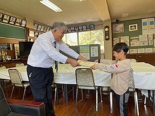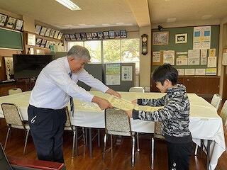 1つ目です。県文集ともだちの作品展において優秀賞を児童5名が入賞し、校長室で表彰しましたのでその模様を紹介します。
