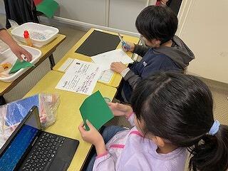 つつみ1組で、生活単元の研究授業がありました。みんなで力を合わせて、材料を活かして、12月のカレンダーをつくりました。授業の冒頭、12月にふさわしいカレンダーにするために、12月(冬)にあるものを考えました。季節感たっぷりの作品に仕上げようという気持ちにみんながなりました。先生と一緒に作り方の確認をし、数字をつくる人、はり絵をつくる人に分かれて活動を進めました。デザインを考えるために、タブレットの検索機能も使いました。色紙や画用紙、上質紙などの材料を使って、みんな夢中になって、つくっていました。完成するのが楽しみです!心を1つにみんなでつくるみんなの授業でした。