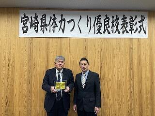 2月17日(月)に、県体力向上優良校の表彰式がありました。学校を代表して、校長と体育主任が式典に参加しました。学校独自のスクールスポーツプラン(体力向上プラン)に基づき、特色ある体育指導及び体育的活動を展開し、体力向上に実績を上げている学校を体力つくり優良校として顕彰されるもので、小学校からは県内で7校、中学校は4校、高校は3校、合計15校が表彰されました。本校は昨年度に引き続き、2年連続での受賞になりました。「きらきら(知育)、にこにこ(徳育)、ぐんぐん(体育・食育)」の「ぐんぐん」の部分の頑張りが認められての表彰で、とてもうれしい限りです。今後も体育指導の充実に向けて、学校のみんなで努力してまいりたいと思います。