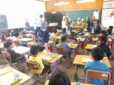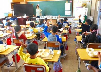 4月16日(水)から、いよいよ1年生の給食開始。「今日の給食、楽しみな人?」の質問に、「はーい!」と元気いっぱいの返事。6年生の給食当番が配膳してくれるのを、静かに目を輝かせながら待っていました。
