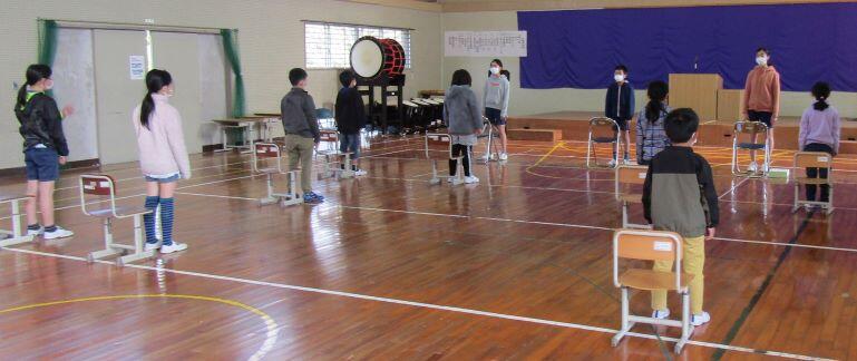 さて、最後の卒業式の練習です。この日は記念品授与、贈呈の動きの確認と、呼びかけ、歌の練習でした。寒かったので、