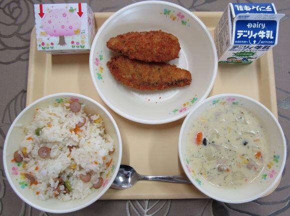 この日のメニューは、次の日が小学校の卒業式なので、お祝いのメニューでした。ピラフ、サケのチーズフライ、
