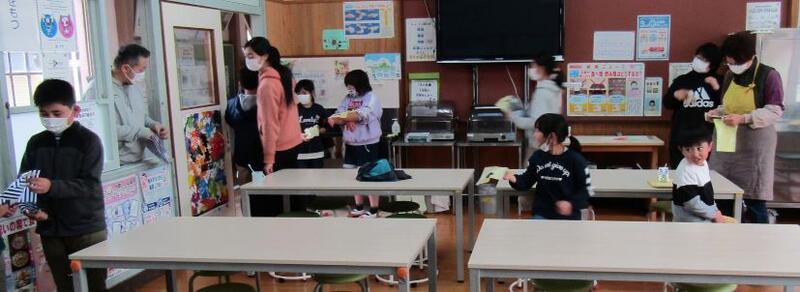 6年生から、お別れのプレゼントがありました。手作りのマスクです。子どもたちと先生方一人一人に作ってくれました。