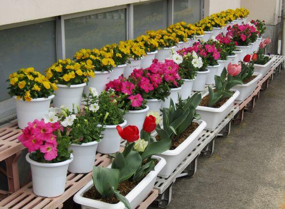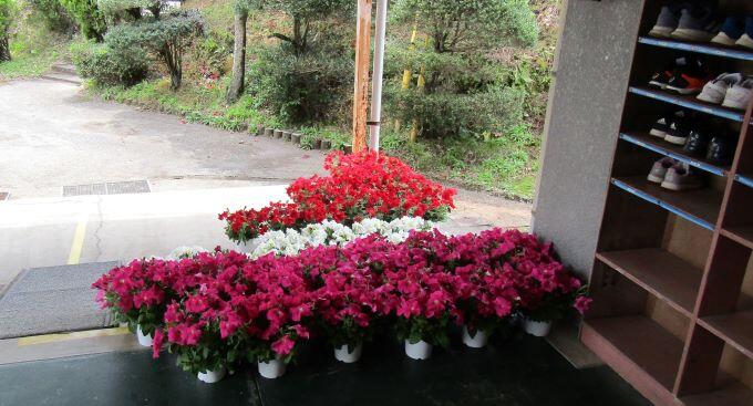 卒業式のための花々です。たくさんそろえていただきました。ありがとうございます。左下は、子どもたちが植えた、