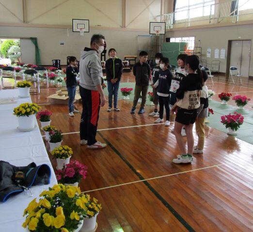 花を並べてくれました。ありがとうね(^o^) 先生方からお別れの言葉をいただいた後、代表の子どもが、先生方一人ずつの思