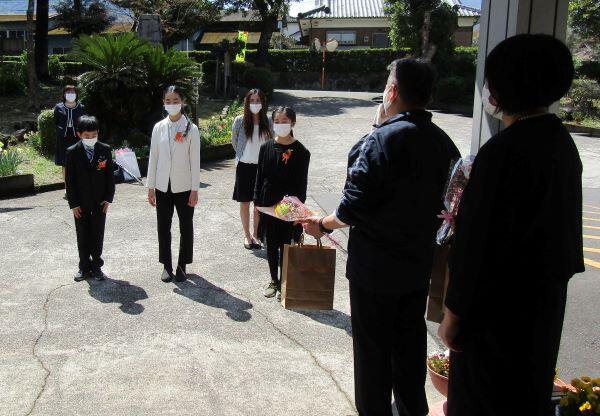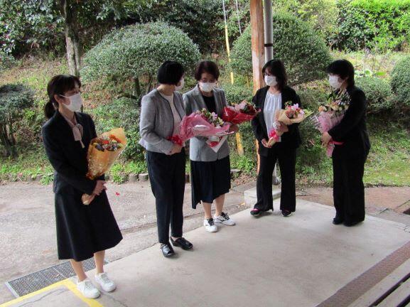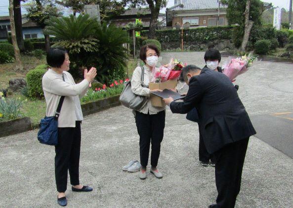 最後のあいさつです。玄関前で先生方一人一人に、お花とメッセージをくれました。