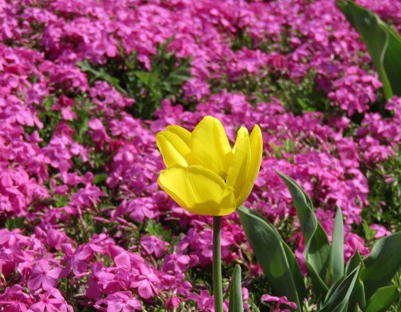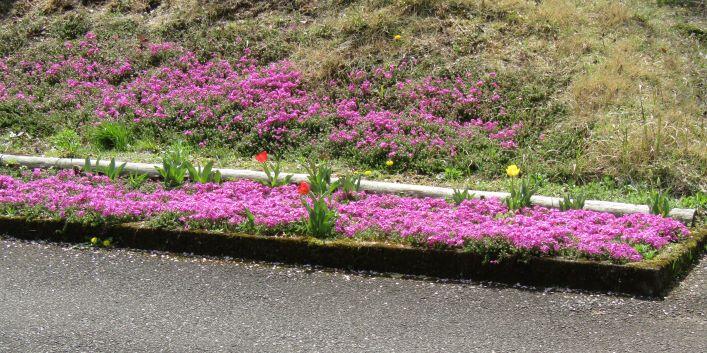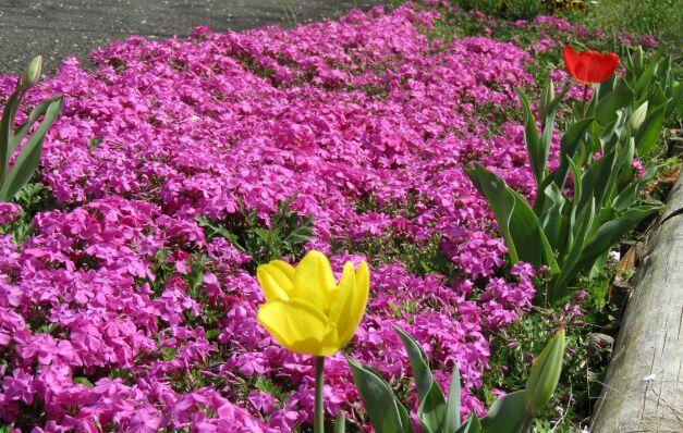 その代わりといっては何ですが、桜の麓の芝桜が満開になりました。鮮やかなピンク色です。チューリップの黄色や赤色と