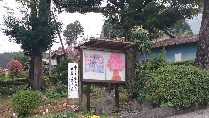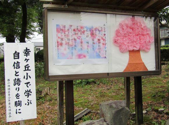 校門の掲示板にも転出される先生方のお名前と桜の木、お礼のことばがありました。