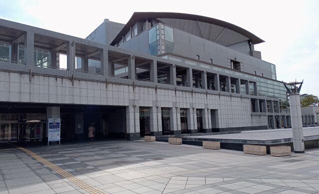 会場のメディキット県民文化センターです。右側のところが演劇ホールです。2階のロビーに展示されていました。