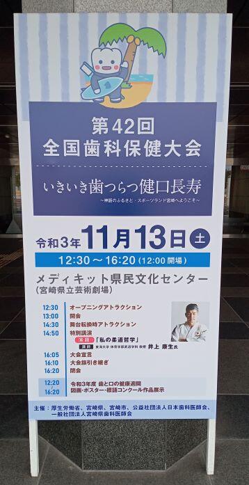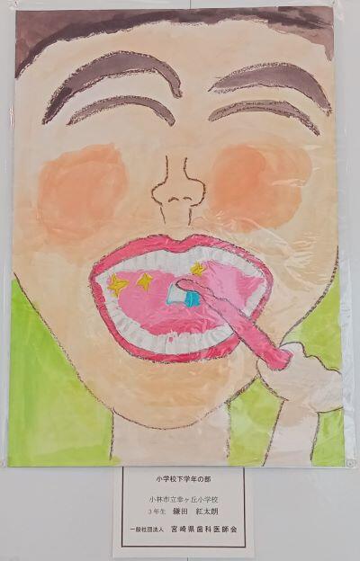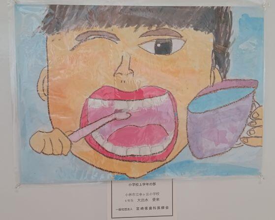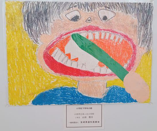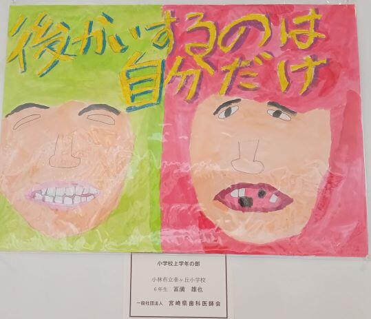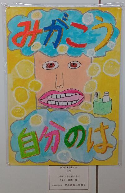 さて、頑張りました!の②です。先週末の13日(土)に宮崎市で第42回 全国歯科保健大会 がメディキット県民文化センター演劇ホールで開催されました。この時に「歯と口に関する健康週間 図画・ポスター・標語コンクール」の入選作品の展示も行われました。以前ご紹介した、本校の子どもたち5人の作品も展示されていましたので、見に行きました。