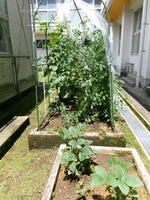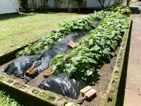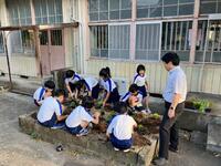 【7月2日】1~4年生の児童が生活科や総合の学習で植えた野菜の苗がすくすく育っています。実もなり始めていて、少しずつ収穫もしています。さつまいも畑も植えた時は頼りなくうなだれていましたが、今では元気にたくさんの葉を広げています。夏休みまでに、まだまだ野菜の収穫ができそうです。楽しみですね。