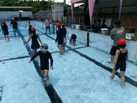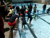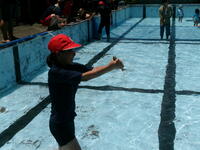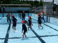 【7月7日】毎年この時期に行われている「魚つかみ取り」(PTA行事)が行われました。学校横にあるプールに水をはり、ニジマスを60匹、鯉を2匹放し、子ども達が素手でつかみ取りをします。30数年前から続いている行事で、幸ヶ丘小出身の保護者も経験しているとのことでした。最初は、慎重に慎重に近づいて捕まえようとしていましたが、そのうち、走りながら追いかけて水に飛び込むように捕まえていました。捕まえた魚は、自分たちでさばき、保護者と先生達とおいしくいただきました。とても楽しい行事で、みんな大満足でした。