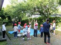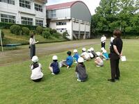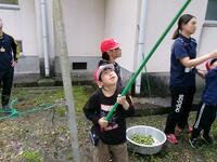 【5月27日】 体育館裏にある梅の木に実がなり、本日全員で収穫しました。長い棒を準備し、見つけたら実や枝を叩いて落としました。みんな歓声を上げながら楽しそうに収穫していました。数は多くありませんでしたが、きれいな実が採れました。