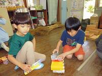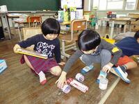 【6月5日】 算数では、計算ばかりでなく形の勉強があります。1年生は、立方体や直方体の形や筒の形の箱や缶を実際に触って、積み重ねたり、転がしたりしてその性質を学んでいきます。みんなニコニコと笑顔でとても楽しそうに学んでいました。