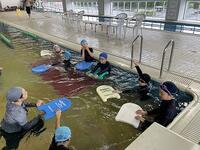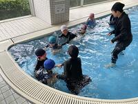 【6月10日】 本校の水泳の学習は、市営プールで行っています。(市内の他の小学校の利用も増えています。)今年も始まりました。全校でバスで移動し、プールに入ります。あいにくの天気で、外のプールには入れませんでしたが、室内のプールで初めての水泳(水遊び)を学習しました。水泳の学習は、泳げるようになることと同時に、命を守る学習でもあります。みんな、楽しみながらも真剣に取り組んでいました。