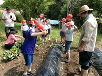 【6月20日】 学校横の畑に芋の苗を植えました。保護者の協力を得て、畝を作り、マルチを張ってもらいました。準備していただいた芋の苗は黄金千貫(こがねせんがん)という品種だそうです。子ども達は棒で穴を開け、一株一株丁寧に植えていました。秋に大きな芋が収穫できたら嬉しいですね。楽しみです。協力いただいたお父さん方、地域の方、ありがとうございました。