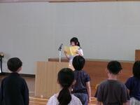 【7月18日】 この4ヶ月の学習の成果を発表する児童集会を行いました。低、中、高学年に分かれての発表です。低学年は、先生達にインタビューしたことと「おおきなかぶ」の劇を発表しました。台詞の言い方やしぐさがとてもとてもかわいくて、教室中が温かい雰囲気に包まれました。中学年は社会科見学(グンゼ工場)と理科の学習の発表でした。総合の学習(いこまタイム)の経験を生かしたとても上手な発表でした。高学年は、リコーダーの演奏とスライドを使った宿泊学習(5年)と社会科見学(6年、市役所)の発表でした。高学年らしい立派な発表でした。日頃からよい学びをしていることの伝わる集会でした。