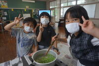 【7月18日】春に植えた野菜の苗が大きく成長し、子ども達は収穫を楽しんでいます。今回は3・4年生が枝豆を収穫しました。水道でしっかりと周りを洗い、塩ゆでにして食べました。校長へもおすそ分けがあり、食べたらとてもおいしかったです。収穫の喜びを味わっている子ども達の嬉しそうな笑顔を見ていると、何ともほっこりしました。