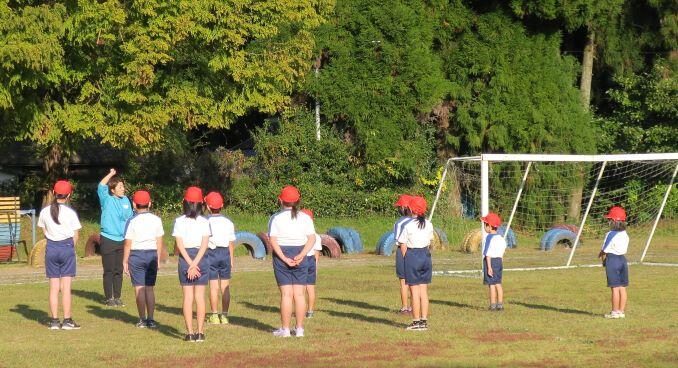 次の時間は、1、2年生合同で体育の時間でした。準備運動をして、授業の内容について説明を聞きます。
