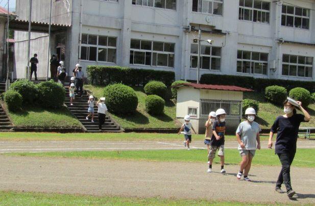 緊急地震速報を流したあと、避難指示があったので、噴火対応のヘルメットをかぶり運動場へ避難しました。