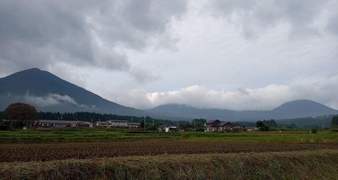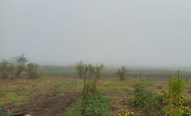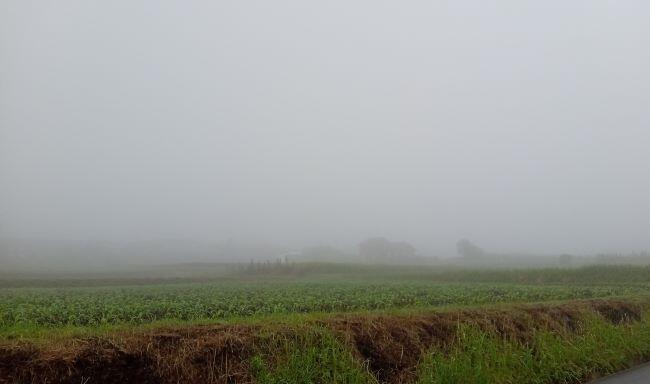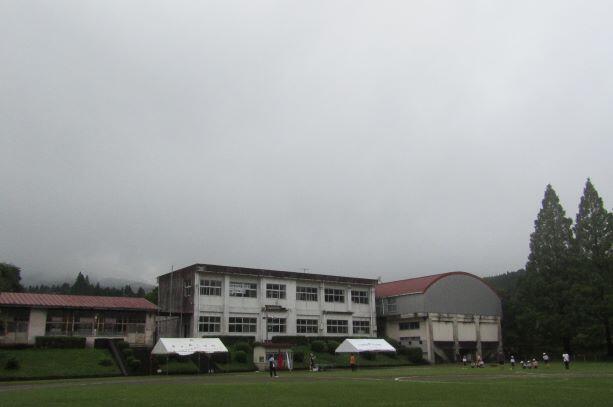 この日の朝の幸ヶ丘三岳(左側)です。台風の影響で天気は良くありません。しかも霧が出ていて学校周辺は視界が良くなかったです。幸ヶ丘三岳も見えませんし、反対側(右側)もご覧の通りでした。