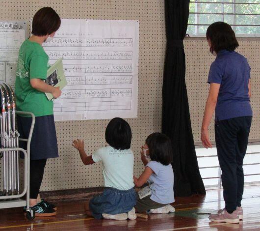 少し、不十分なところは壁の譜面を見ながら練習しました。1年生と2年生は仲良く並んで練習しました。
