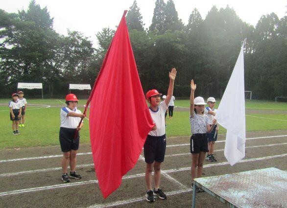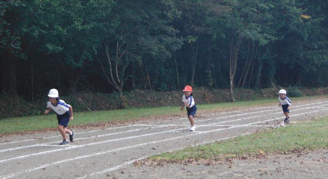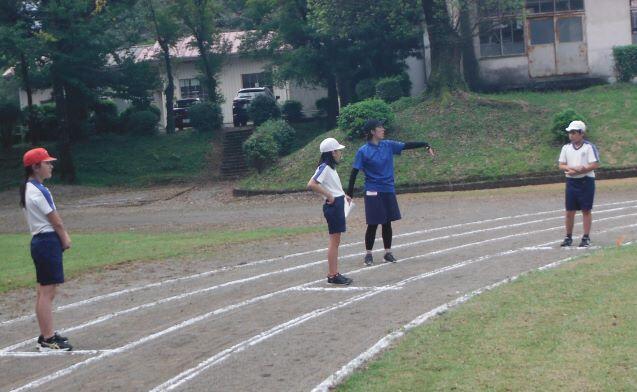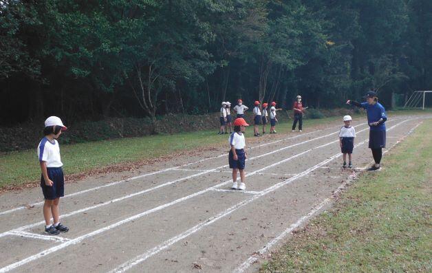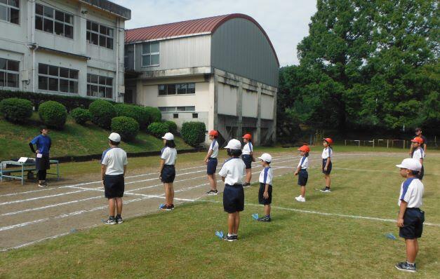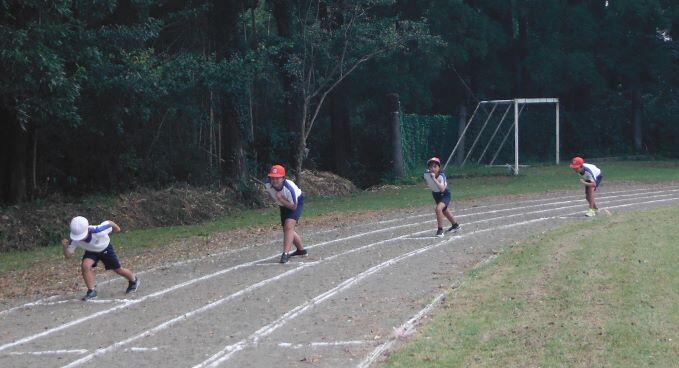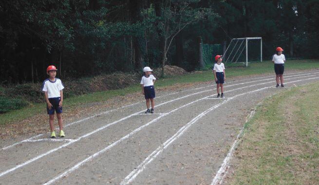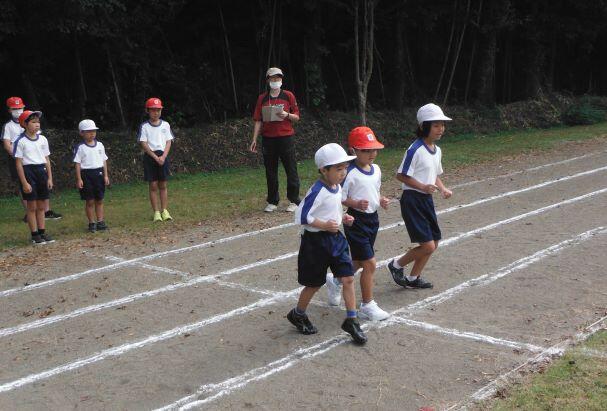 次は徒走の練習です。自分のスタート位置を確認しました。そして、50m走をしました。1年生には「よーい!」