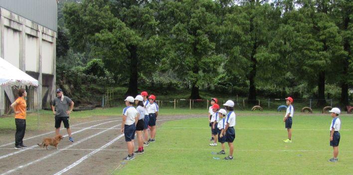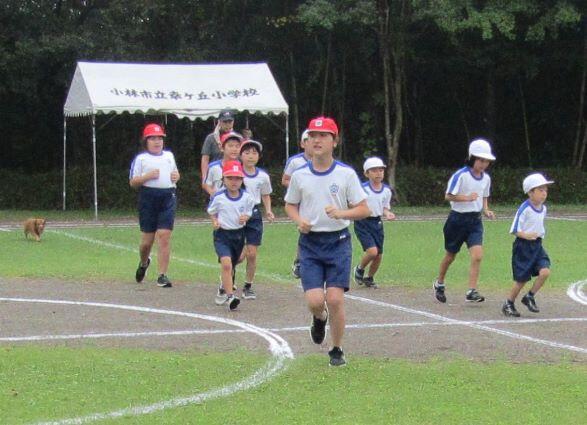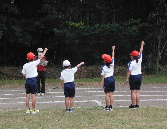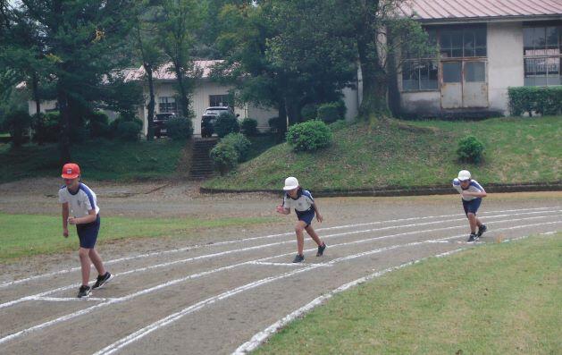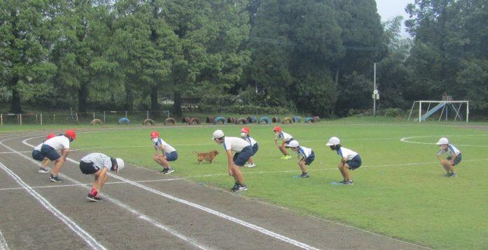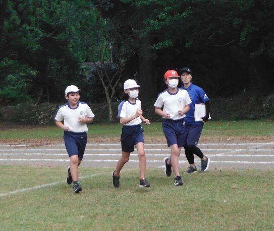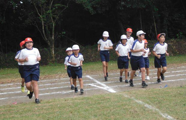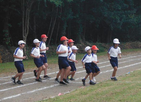 走ります!走ります! 1・2年生、3・4年生、そして5・6年生が一緒に走ります。走り前には名前を紹介するので、