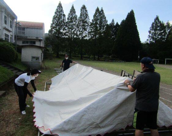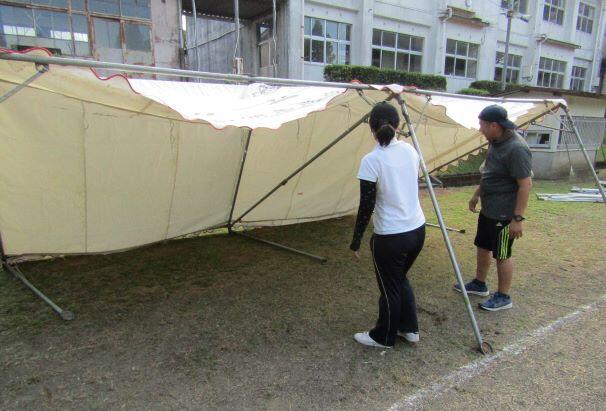 頑張ります。右側は雨が降らないうちに、また、少ない職員でテントを2張り立てました。もう、慣れたもんです!(^_^)v