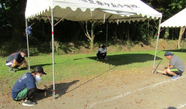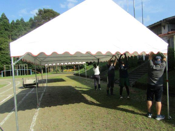 午後からは保護者の方のお手伝いです。テントを1張り、お母さんたちはテントに長机やイスを運び込み、拭きます。そして、