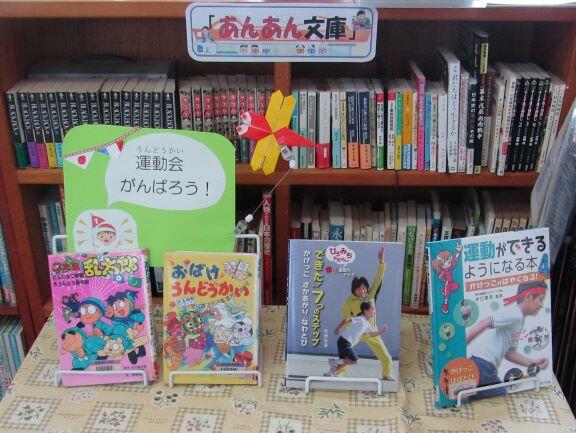 次は図書室です。運動会に合わせて、関連する本が紹介されています。「あんあん文庫」もそろそろ追加をしたいと