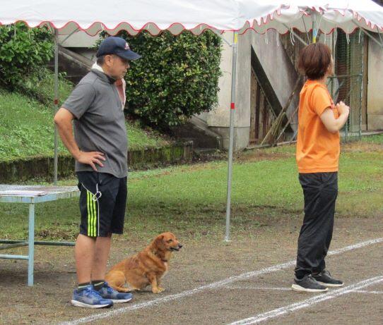 団技の入退場の確認です。見守り犬も付いて行きました。入場の時も退場の時も・・・。(^^)