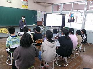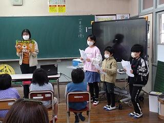 保健体育給食委員会の子どもたちが紙芝居「おやおやもったいない」を読んだ後、