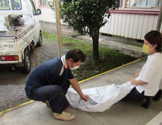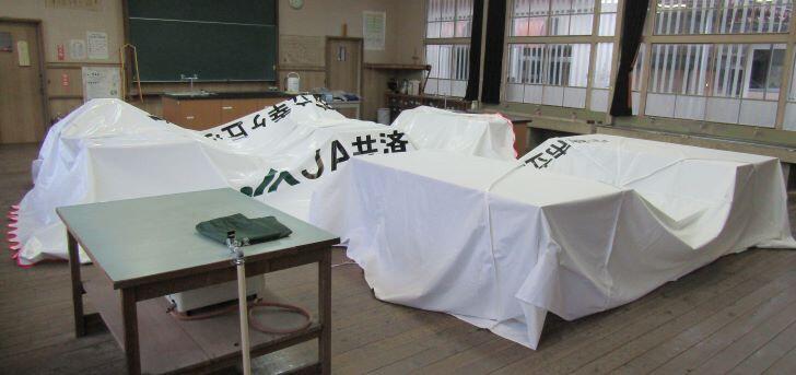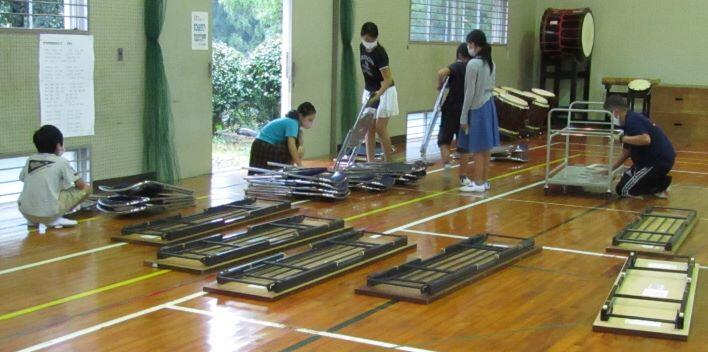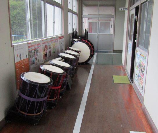 北校舎1階においていた太鼓を体育館へ運びました。一部濡れていたテントの天幕は理科室に入れて干していました。