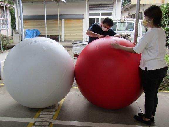 大玉の空気を入れる作業です。右側のコンプレッサーを使って空気を入れます。タンクが2本あるものは