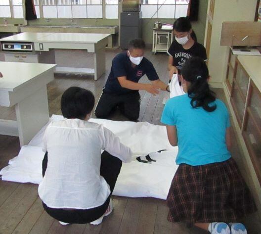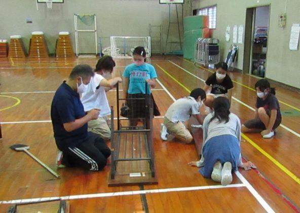 3・4年生は装飾の花をほどいてきれいにします。5・6年生は運動場で使ったイスや長机の足を拭いたり、