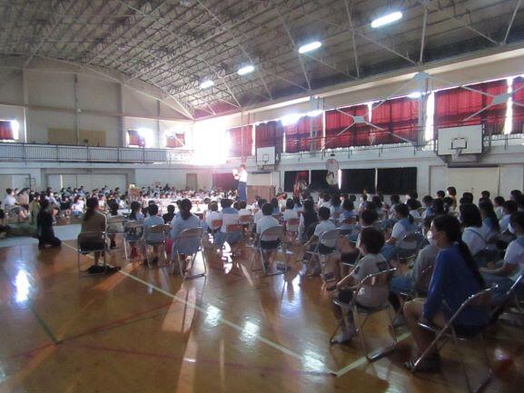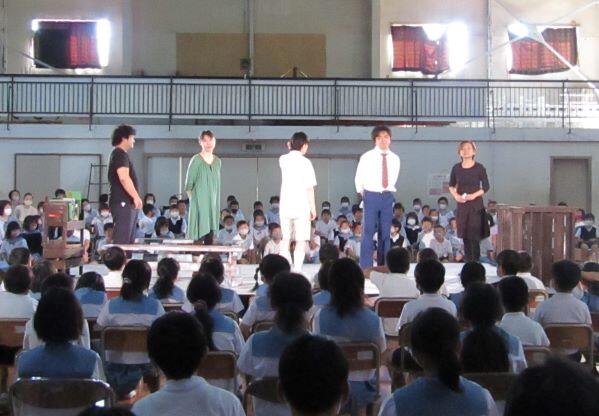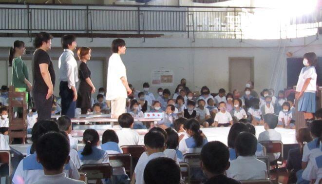 体育館の中央に舞台があり、ステージや通路使い、子どもたちも舞台に上がりました。久しぶりに演劇を見て、表現することの素晴らしさを感じました。子どもたちも大いに楽しめたようです。劇団こふく劇場のみなさん、ありがとうございました。