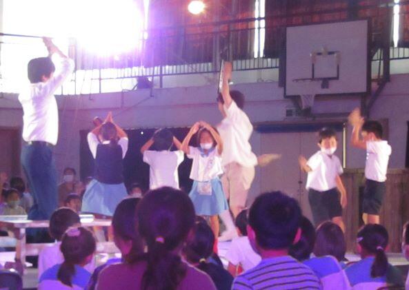 子どもたちも舞台に上がって演じ?(踊り?)ました。(^o^) 最後に児童代表がお礼の言葉を述べて、終わりました。