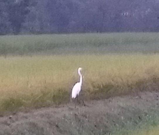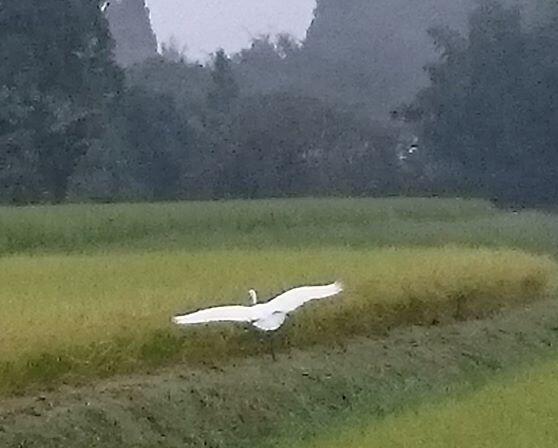 垂れ下がりも大きくなっていました。畦のところに、鷺(サギ)がいました。いつも見かけるのは1羽だけです。