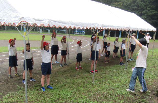 雨が降ってきたので、テントの中で応援の歌の練習をしました◯、◯、◯、ゴーゴーゴー!どちらが大きい声かな?