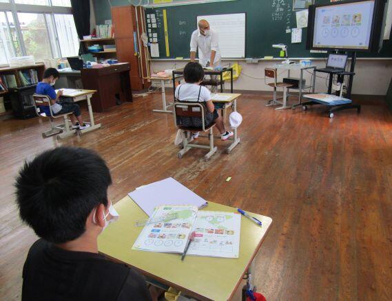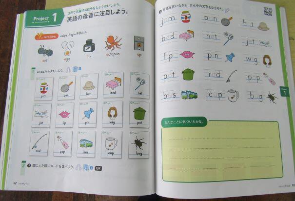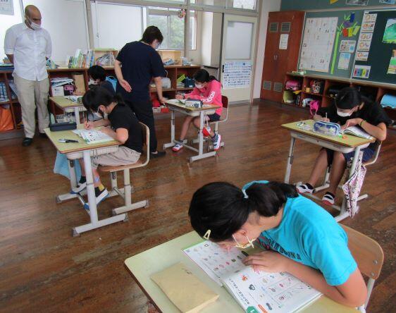 5・6年生の授業の様子と使っている教科書です。アルファベットを書くことも今年度から本格的に始まりました。