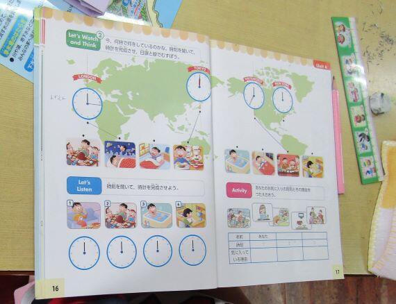 下は3・4年生が使っているテキストと授業の様子です。時間や場所を聞き取る活動でした。