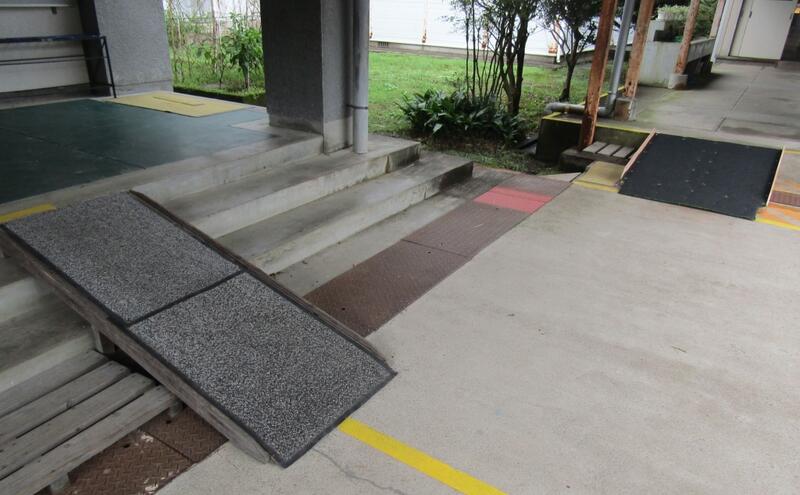 子どもたちの通行もこれで安心です。本当にありがとうございました。手前の体育館へのスロープはまだ古いものです。
