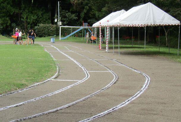 太鼓やイスを運動場に近いところまで運びました。メインはやはり、運動場ですね。トラックの部分をきれいにはいてから、ラインを引きました。きれいな会場ができました。細かいところは明日の朝に行います!