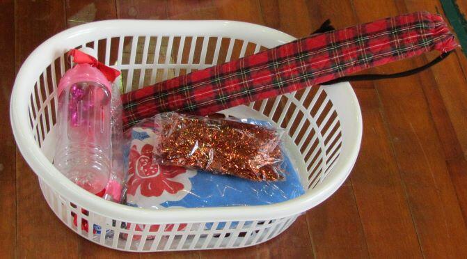 荷物を入れるかごを用意しました。太鼓のばち、ダンスのキラキラ(何というのか分かりません(>_<))、