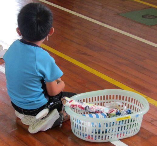 太鼓の時に着る法被(はっぴ)のサイズ確認、応援用具 などを他の人と交じらないようにします。