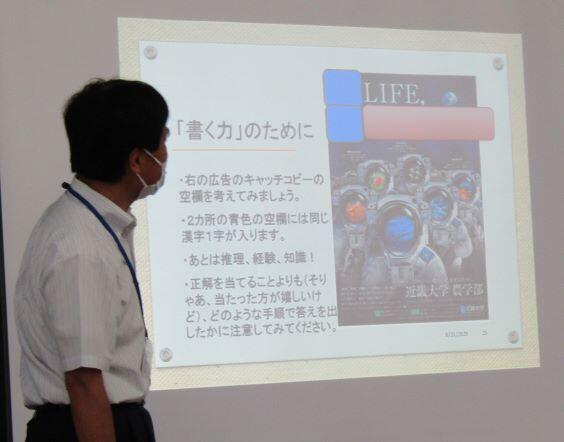 講義では、2018年のPISAの問題を使って、読解力についてお話していただきました。研究への新しい視点やアプローチの方法等、今後の研究の取組に大変役立つ内容でした。私はお話を聞いて、“自分たちの研究の方向性が間違っていなかった”と安心感をもちました。最後に、ある大学のキャッチコピーを示され、正解を求めることよりも、どのような手順で答えを出したかに注意してみてくださいとおっしゃいました。ちなみに下の写真の青の部分には「農(no)」が入ります。オレンジの部分は何でしょうか?(よく見かける、 No、◯◯、 No、Life の型です。) おまけです。ツクツクボウシが鳴いていました(^o^)