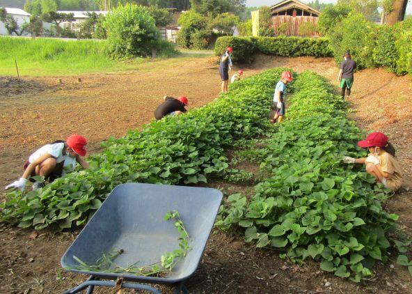子どもたちと先生方は、イモ畑(子ども農園)や花壇の草取りをしました。