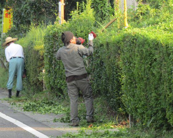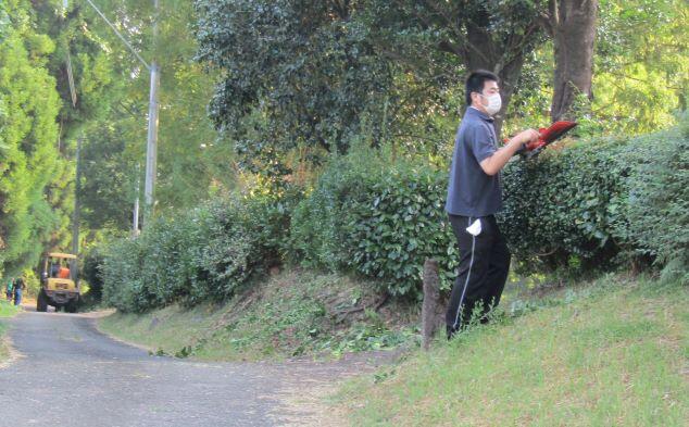 学校の南側と西側の垣根の剪定作業です。トリマーが大活躍です(^_^)v