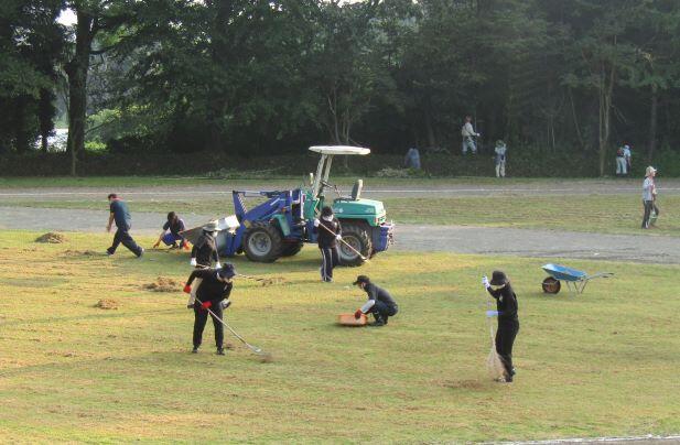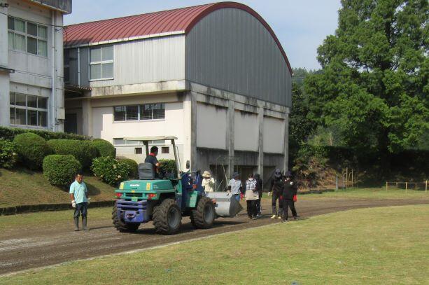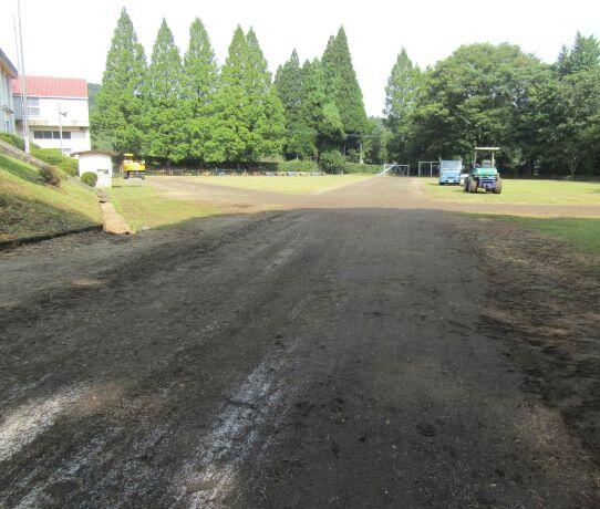 運動場のトラックの部分と直線コースの部分を重機でていねいにならしてくださいました。その後、地面を固める